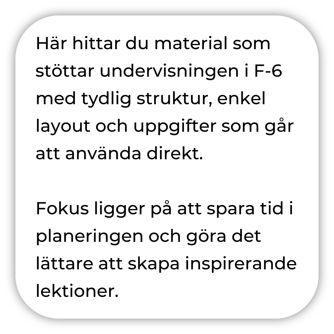 Materialet för F-6 är framtaget för lärare som vill ha färdiga, genomtänkta resurser som ändå går att anpassa efter grupp och nivå.